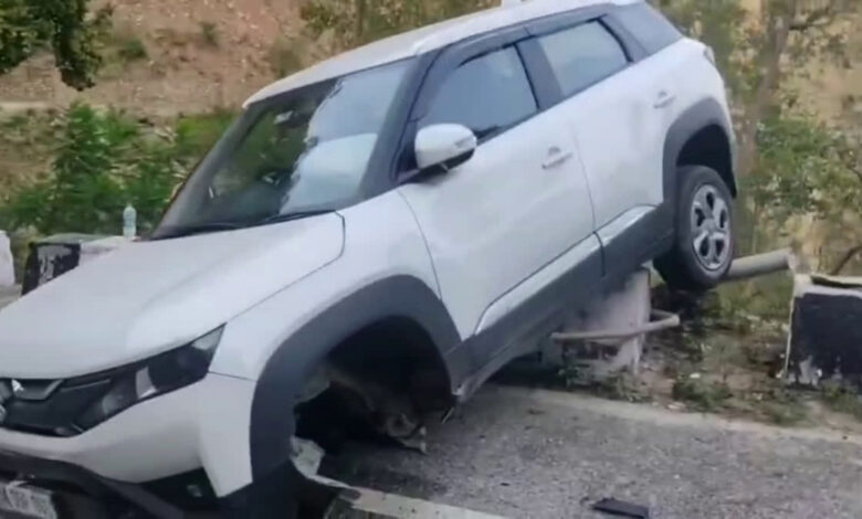 खटीमा। चंपावत जिले के लोहाघाट तहसील क्षेत्र में एक तेज रफ्तार कार अनियंत्रित होकर पैराफिट से टकरा गई। हादसे के दौरान कार इतनी स्पीड में थी कि कार के आगे के दोनों टायर टूट कर अलग हो गए। वहीं, कार पैराफिट में लटकने की वजह से खाई में गिरने से बच गई, जिससे बड़ा हादसा होते-होते टल गया।