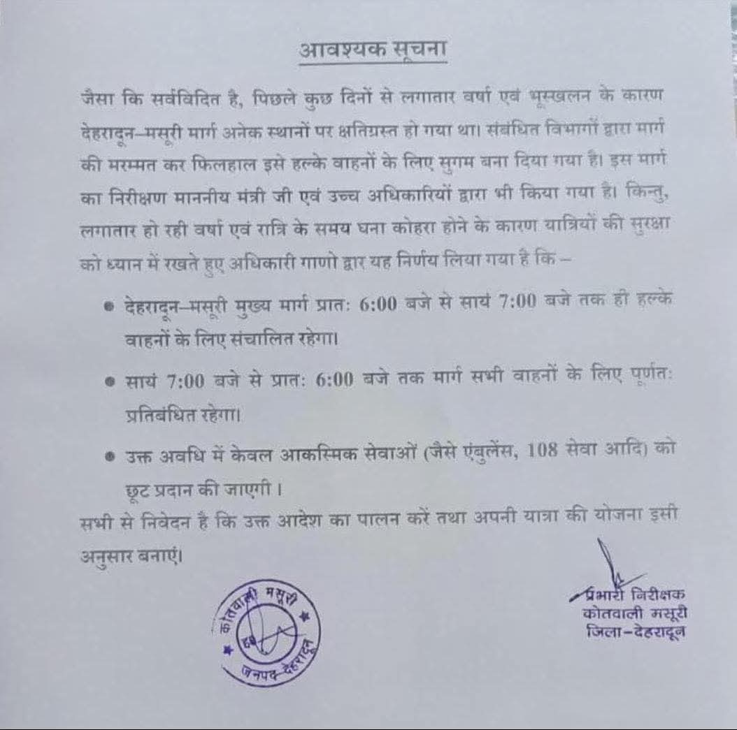 इसी बीच शुक्रवार को देहरादून जिला प्रशासन ने बड़ा फैसला लिया है। भारी बारिश के बने हालात को देखते हुए देहरादून मसूरी मार्ग पर आवाजाही के लिए समय सीमा तय कर दी है। देहरादून-मसूरी रोड पर सुबह 6 बजे से शाम 7 बजे तक ही आवाजाही हो सकेगी। शाम सात बजे से सुबह छह बजे तक यह मार्ग पूरी तरह से बंद रहेगा। प्रशासन का कहना है कि लगातार भूस्खलन, टूटी सड़कों और घने कोहरे की वजह से रात के समय हादसों का खतरा अधिक बढ़ जाता है। ऐसे में यात्रियों और पर्यटकों की सुरक्षा को ध्यान में रखते हुए यह निर्णय लिया गया है। प्रशासन ने साफ किया है कि भारी और बड़े वाहनों को मसूरी जाने की अनुमति बिल्कुल नहीं होगी, केवल छोटे वाहनों और सार्वजनिक परिवहन को ही तय समय सीमा में चलने दिया जाएगा। मसूरी को पर्यटकों की पहली पसंद माना जाता है। हर साल लाखों सैलानी यहां घूमने आते हैं, लेकिन बीते दिन हुई बारिश से मसूरी को भी नुकसान पहुंचा है।