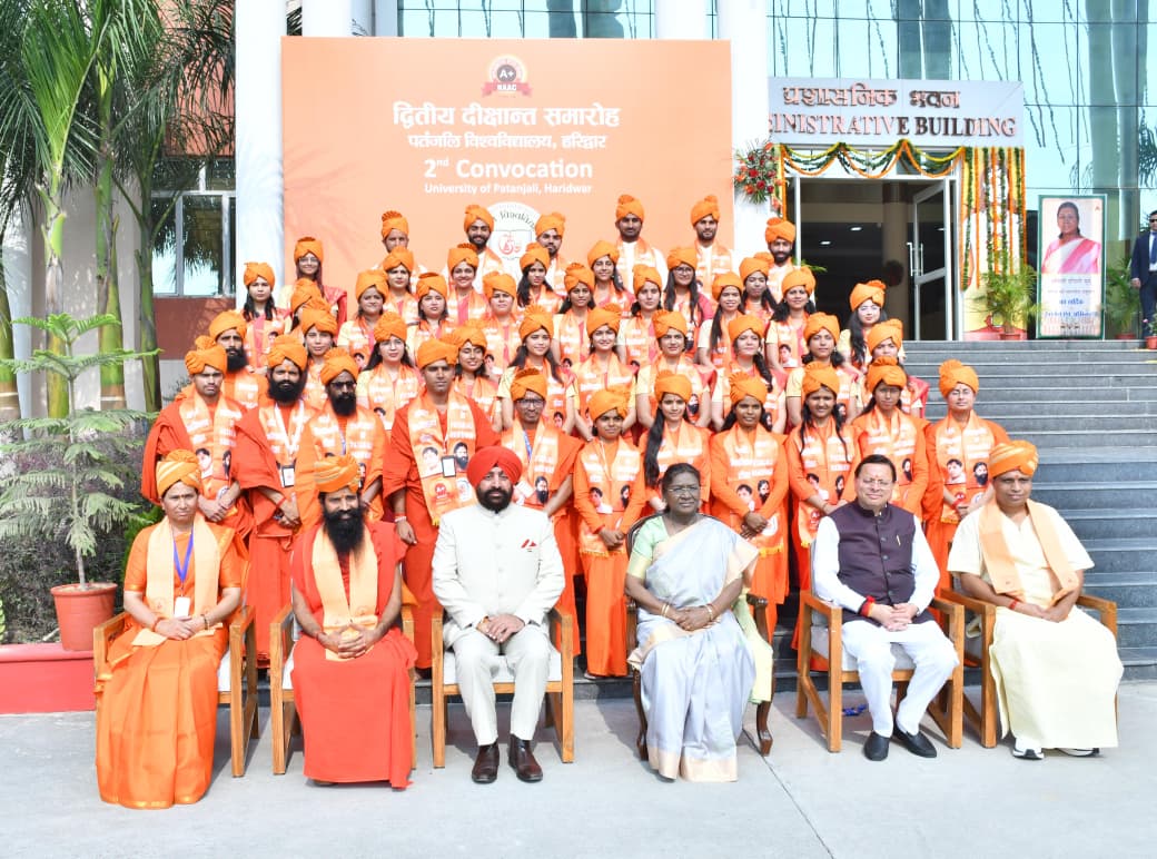 माननीया राष्ट्रपति महोदया ने कहा कि योग, आयुर्वेद और अध्यात्म के क्षेत्र में पतंजलि ने जो कार्य किया है, वह महर्षि पतंजलि की परंपरा को आगे बढ़ाने का महान प्रयास है। राष्ट्रपति ने कहा कि इस विश्वविद्यालय में शिक्षा के साथ संस्कार, विज्ञान के साथ आध्यात्म और ज्ञान के साथ व्यवहार का अद्भुत समन्वय है, जो ‘वसुधैव कुटुंबकम्’ की भावना को साकार करता है। इस अवसर पर उन्होंने विद्यार्थियों से आह्वान किया कि वे तपस्या, सरलता और कर्तव्यनिष्ठा को अपने जीवन का आधार बनाएं और भागीरथी की तरह कठिन परिश्रम कर समाज और राष्ट्र के उत्थान में योगदान दें। उन्होंने कहा कि पतंजलि विश्वविद्यालय ने व्यक्ति निर्माण के माध्यम से राष्ट्र निर्माण का मार्ग अपनाया है। राष्ट्रपति ने इस विश्वास के साथ अपना उद्बोधन समाप्त किया कि पतंजलि विश्वविद्यालय के विद्यार्थी विज्ञान और अध्यात्म के समन्वय से आदर्श जीवन निर्माण में सहायक होंगे और पूरे विश्व में योग, प्राणायाम और भारतीय जीवनदर्शन का प्रसार कर भारत को पुनः विश्व गुरु बनाएंगे।